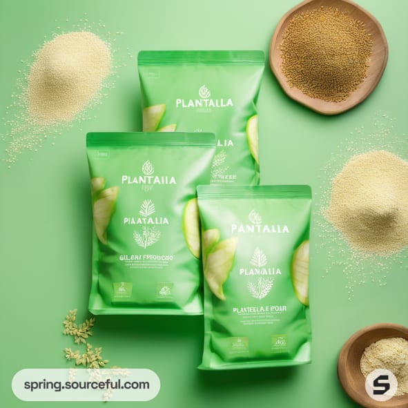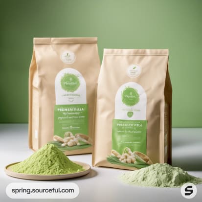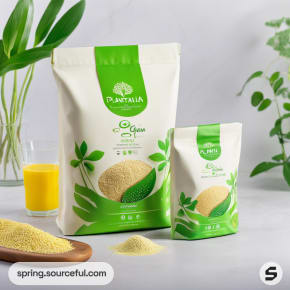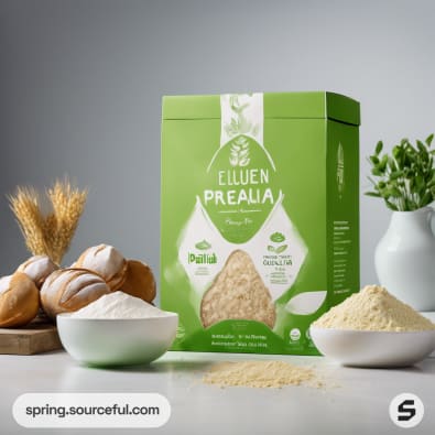 Discover luxurious and vibrant packaging inspiration for gluten-free premix flour, designed with an eco-friendly approach. Our product is beautifully presented in a recycled mailer bag, boasting a fresh color scheme of light green, white, and cream. This packaging not only ensures the quality of the flour but also contributes to environmental sustainability. Experience the perfect blend of luxury and responsibility with our gluten-free premix flour packaging.