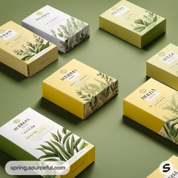 Array of seven herbal tea boxes with green and yellow botanical themes.