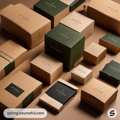 Assorted brown and green boxes with elegant branding on tan background.