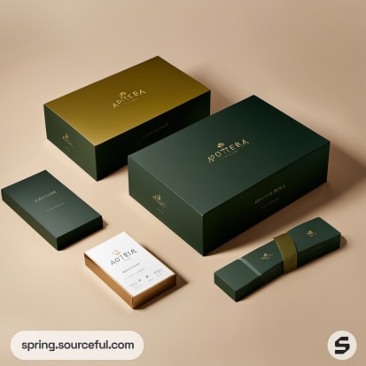 Sophisticated green and gold boxes with minimalist design on beige.