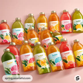 Variety of juice bottles with colorful fruit-themed labels.