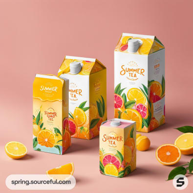 Cartons of summer tea with citrus illustrations on a pink background.