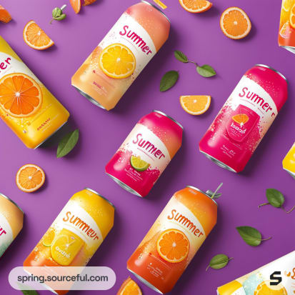Cans of fruit drinks with orange and pink labels on a purple background.