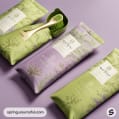 Pouches and cylinder packaging with floral designs alongside a bamboo toothbrush on a neutral background.