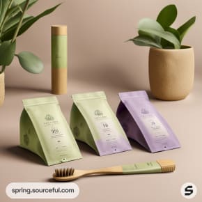Green and purple resealable pouches with a bamboo toothbrush on a table with plants in ceramic pots.