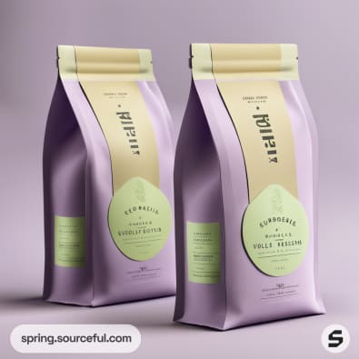 Two resealable pouches with plant illustrations; one green and one purple. A cut lime and various herbs are scattered around.