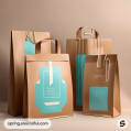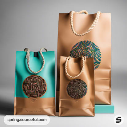 Brown and teal paper bags with handles and graphic designs on a beige background.