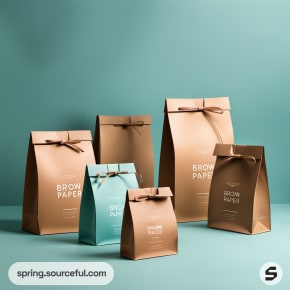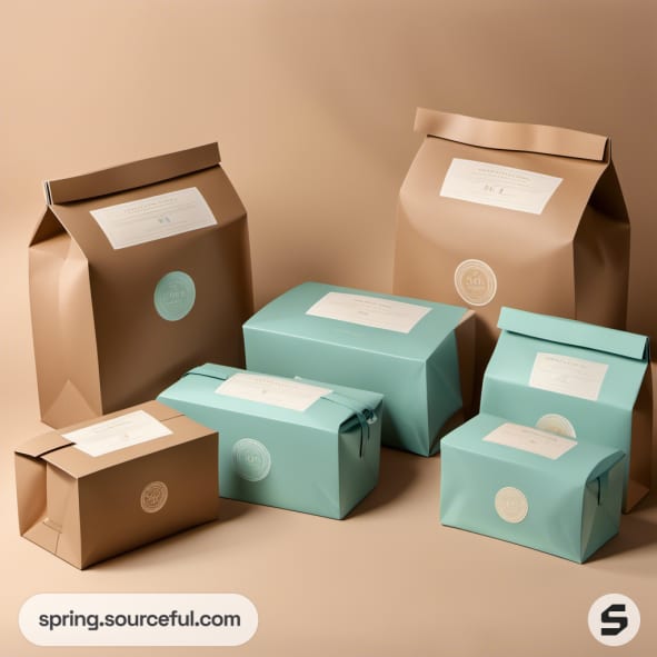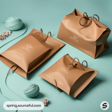 Brown and teal paper bags with minimalist design set against a neutral background.