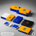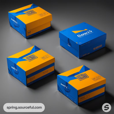 Four blue and orange mailer boxes with angular design patterns on a gray surface.