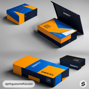Collection of varied size boxes with orange, blue, and black color schemes and QR code designs.