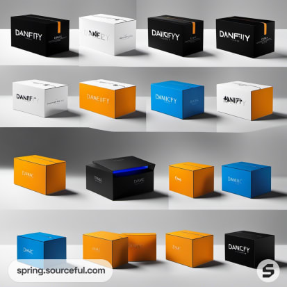 A variety of black, white, orange, and blue boxes with minimalist text on a neutral background.