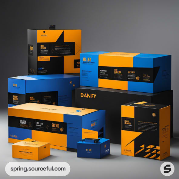 Black and blue large mailer boxes with abstract orange and blue pattern accents.