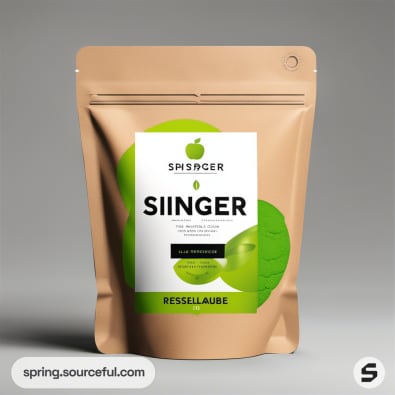 Brown resealable pouch with green apple graphic and white label.