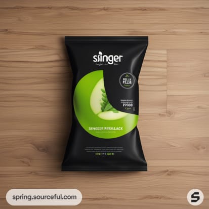 White resealable pouch with green label on neutral background.