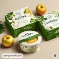 Boxes and bowls with lids, packaging pasta with green leaf motifs, apples on a neutral background.