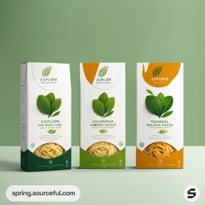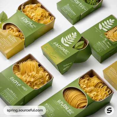 Tall rectangular boxes in green and orange with pasta images, standing against a light green background.
