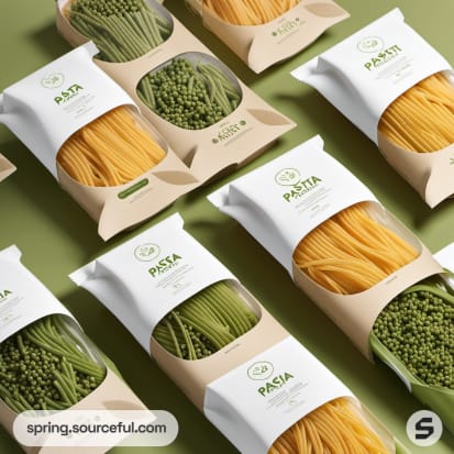 Clear plastic bags with cardboard sleeves showcasing green and orange pasta on a green background.