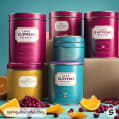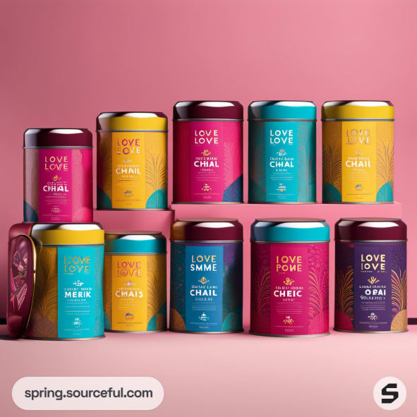 Colorful tins of tea with vibrant designs on a pink background.