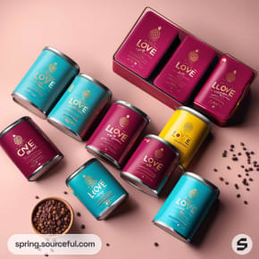 Array of maroon and teal tins with coffee beans on a pink surface.
