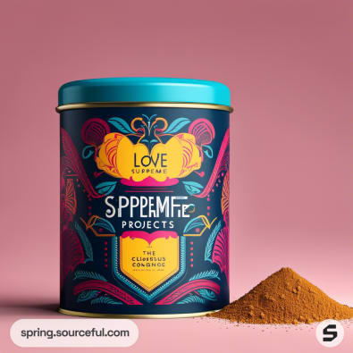Intricate patterned tea tin with loose tea powder on a pink surface.