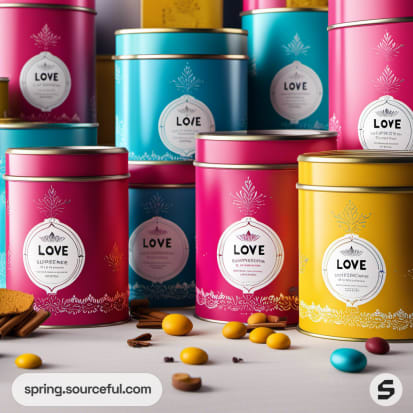 Colorful cylindrical tins with leaf designs on a blue background.