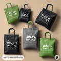Assorted eco-friendly bags in green and black, multiple designs.