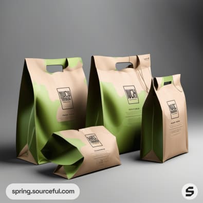 Kraft paper bags with green accents, various sizes.