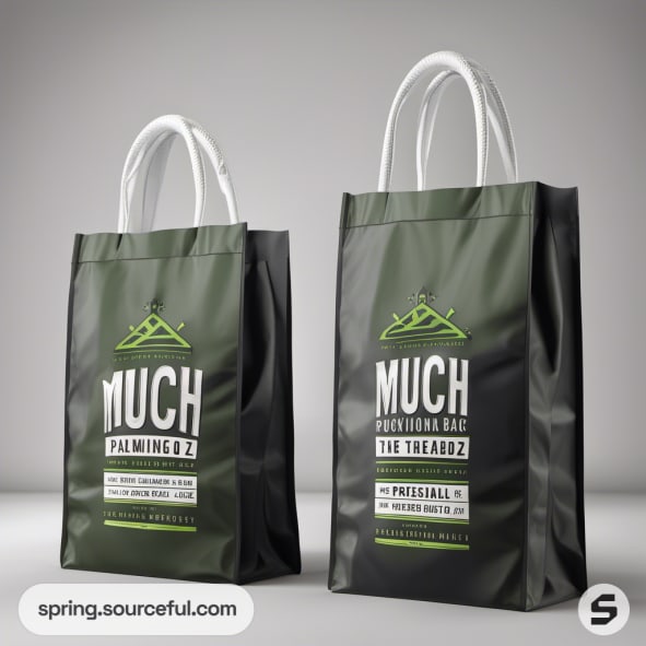 Green and black paper bags with white handles, branding.