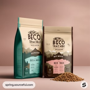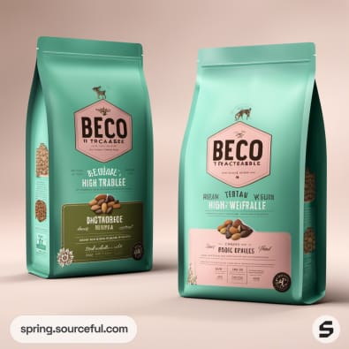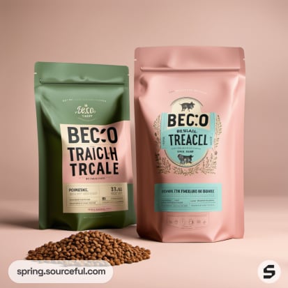 Two resealable pouches of animal food on a plain surface.