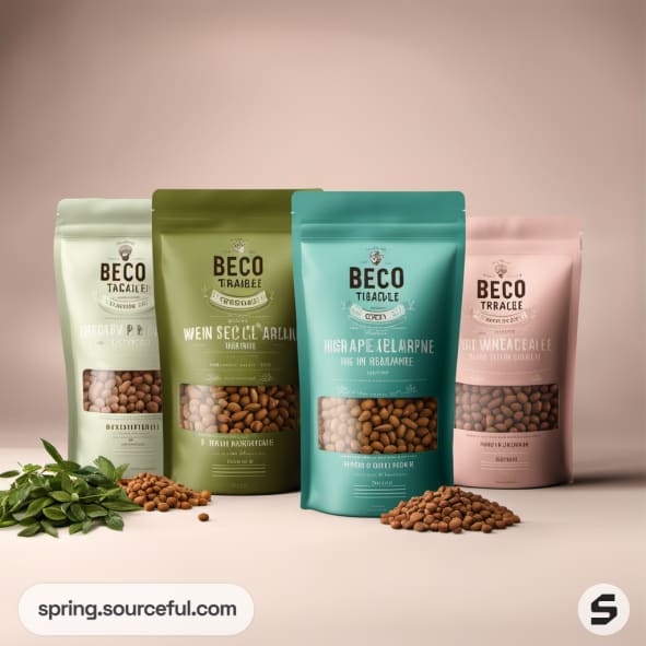 Four bags of animal food in pastel colors with scattered grains.