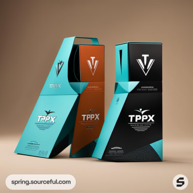 Assorted TPX boxes in teal and black with bold typography