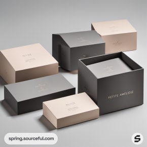 Elegant nested boxes in gray and beige tones with branding on each box.