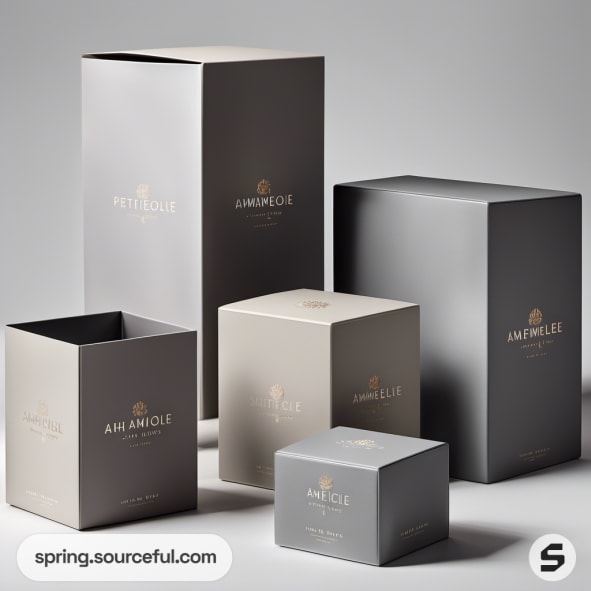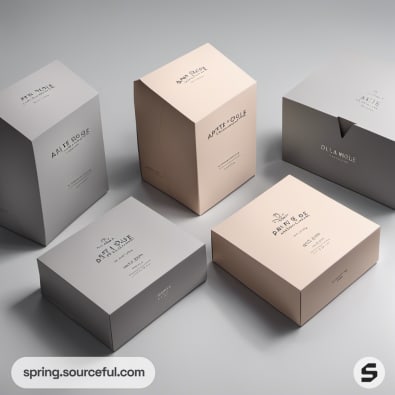 Group of five minimalist gray boxes with subtle logos on a soft background.