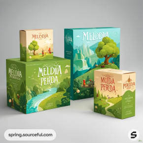 Stacked boxes with nature-themed designs on green background.