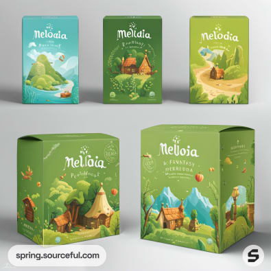 Assorted green boxes featuring whimsical castle illustrations.