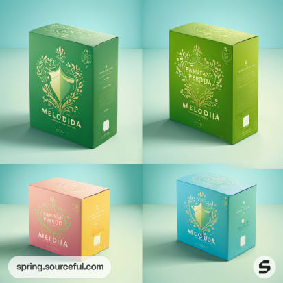 Four green and pastel boxes with floral and crest designs.