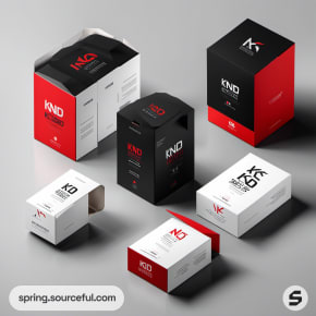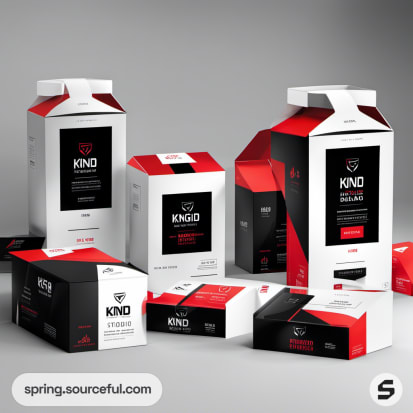 Assorted boxes with angular designs in black, red, and white.