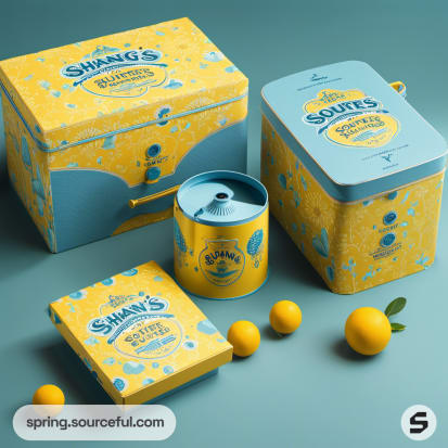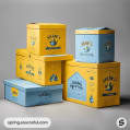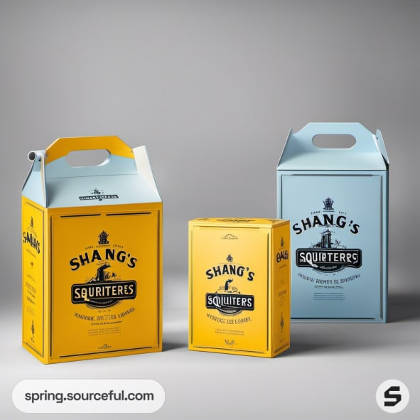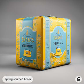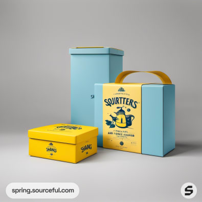 Blue and yellow gift boxes with handles and 'Squirters' branding.