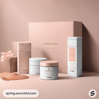 Elegant haircare packaging with various boxes and a large container.