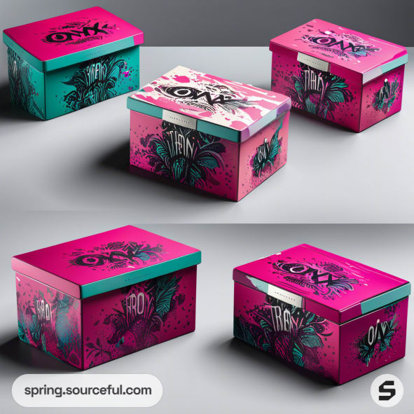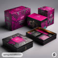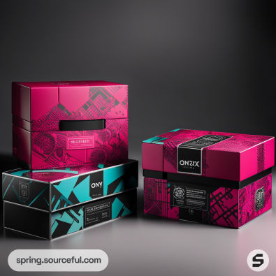 Stacked pink and black geometric pattern boxes with open box showing contents, against a gray background.