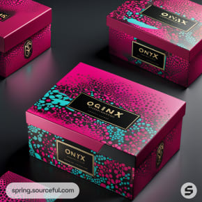 Pink and black shoe boxes with abstract patterns and gold labels, placed on a dark surface.