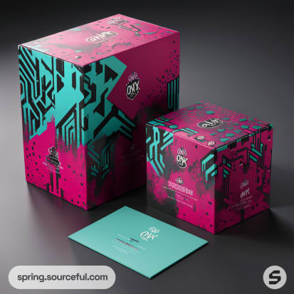 Two vibrant geometric mailer boxes, one large magenta and cyan, the other smaller with abstract patterns.