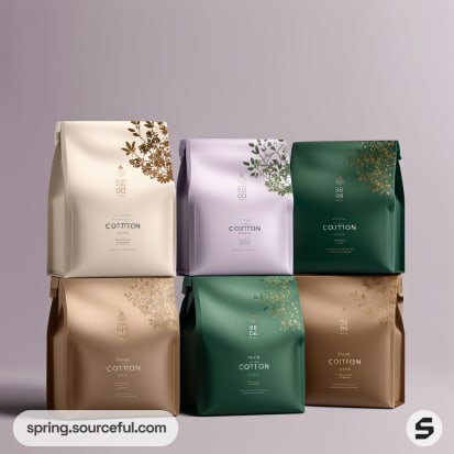 Various organic cotton pouches in earthy tones with minimalist branding.