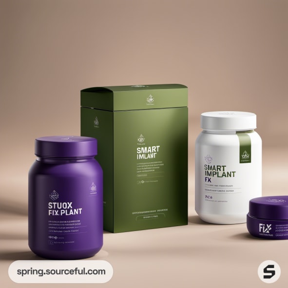 Assorted supplement containers with green and purple designs, including jars and boxes on a beige background.