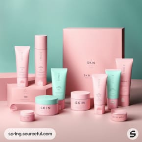 Pastel skincare products with pump bottles, tubes, and jars on a pink box backdrop.