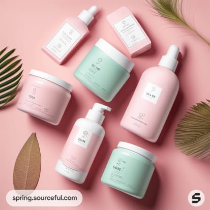 Assorted pastel skincare bottles and jars on pink surface with leaves.