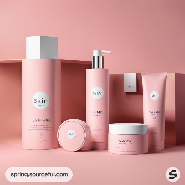 Pink skincare packaging set with various bottles and containers against a pink and teal background.