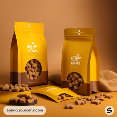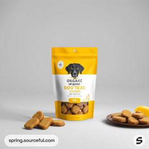 Yellow resealable pouches with dog treats, featuring playful dog illustrations and text, surrounded by scattered treats.
