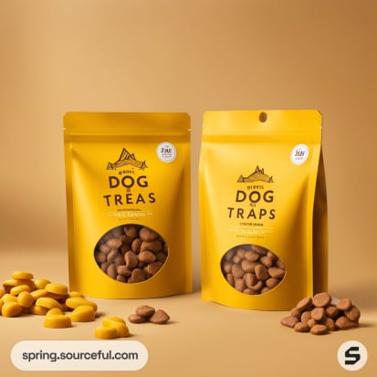 Two yellow resealable pouches labeled 'Dog Treas' and 'Dog Traps' with dog treats spilling out.