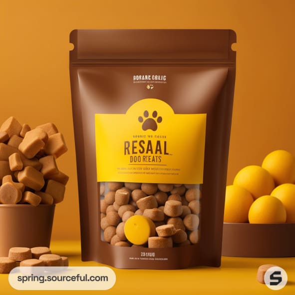Brown resealable pouch with dog treats and yellow label, surrounded by treats and yellow spheres.